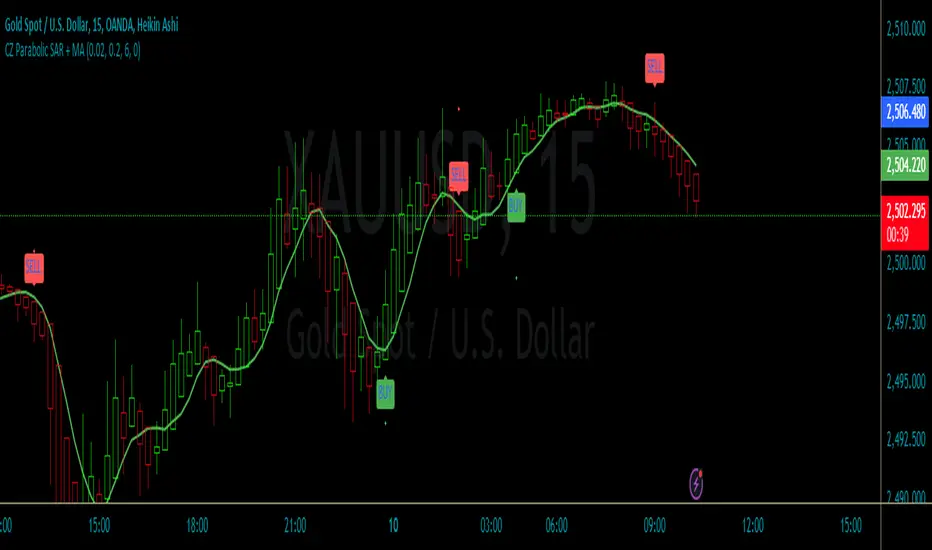 The "CZ Parabolic SAR + MA" indicator combines a Parabolic SAR (PSAR) and a Moving Average (MA) to generate buy and sell signals, with an optional noise filter based on the MA. Here's a breakdown of how to use the indicator and its key parameters: