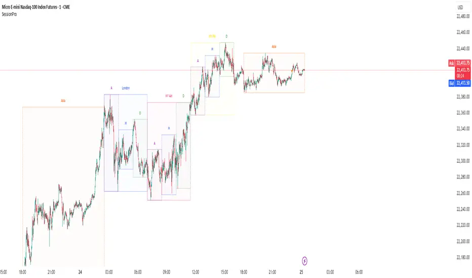 Session Pro is a powerful and highly customizable indicator designed to visualize key trading sessions and their internal phases directly on your chart. It's built for traders who base their strategies on time-of-day dynamics, market opens, and specific session profiles.This tool moves beyond simple session boxes by allowing you to map out detailed sub-sessions (e.g., Accumulation, Manipulation, Distribution phases) within the main trading windows, giving you a clearer view of the market's structure throughout the day.
