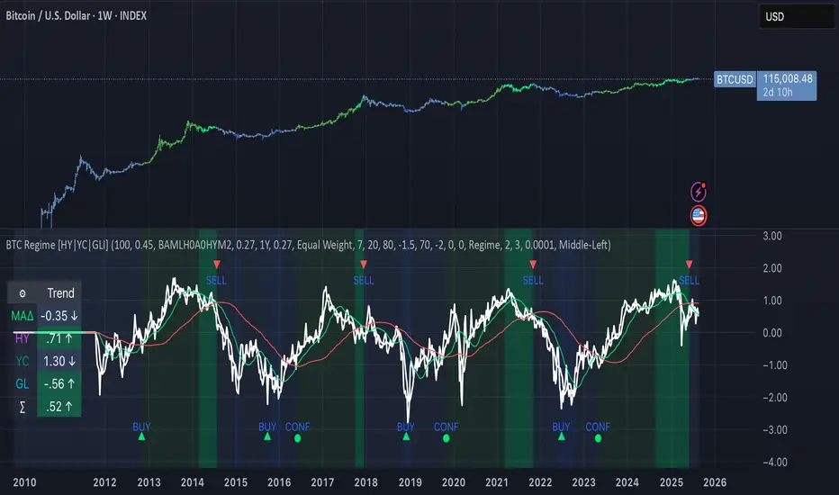 Features: Users can enable or disable each component, adjust weights and choose a short‑tenor (1‑year or 2‑year) for the yield curve. The script automatically scales lookback windows based on the chart timeframe (daily, weekly or monthly). It offers visual plots of each Z‑score, the composite score, and smoothed moving averages, with background colours highlighting regimes and markers for entries and exits. Trade logic includes optional dip‑buy triggers when the composite falls below a threshold, Friday‑only execution on daily charts to reduce whipsaws. A trend table summarises current Z‑scores and their trends. Settings are tuned for BTC weekly data but should be adjusted for other assets or timeframes. Because some inputs (e.g., GLI weights) have limited historical data, long backtests may be less reliable when using on other Risk On Assets like
