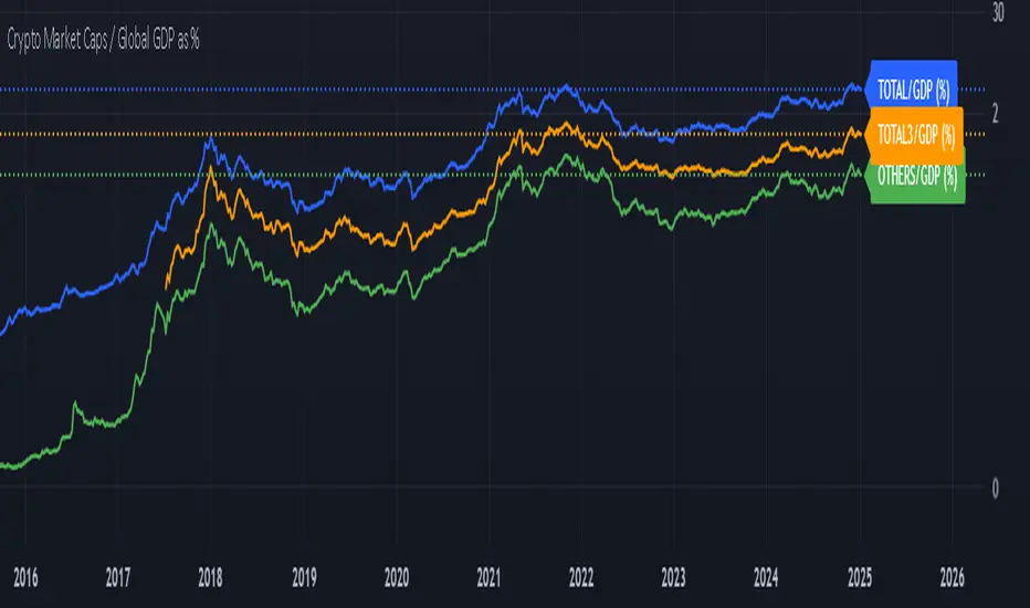 The market caps (TOTAL, TOTAL3, OTHERS) are compared to the global GDP, and the result is expressed as a percentage. This allows you to easily see how the size of the cryptocurrency market compares to the entire global economy at any given time.