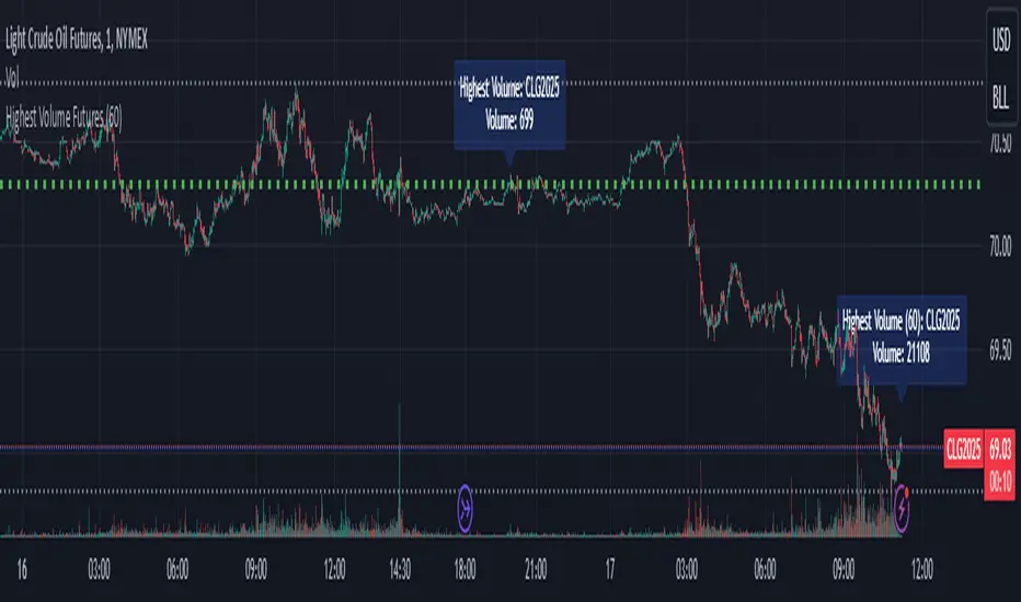 Script tracks the volume of futures contracts which are not expired for the current and next year. Provides a label at the real-time bar and when a different contract has higher volume in the last bar of the timeframe input as long as it is different from the current ticker. It should display on continuous and lower volume contract charts.
