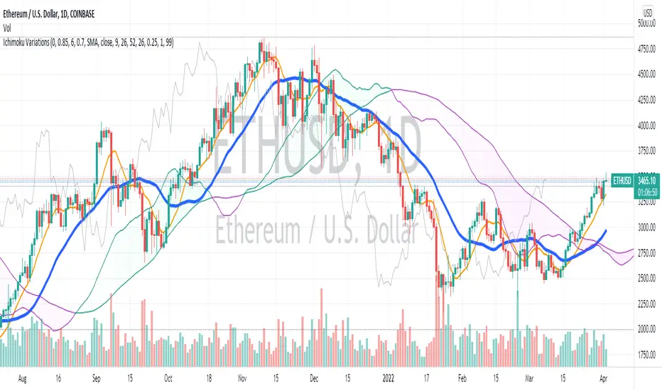 The Ichimoku cloud is traditionally constructed from the highest high and lowest low for a number of periods. This script allows for it to be transformed and calculated like more traditional moving averages (e.g. simple moving average, exponential moving average). Since the Ichimoku is normally a system of moving average-like lines, maybe someone out there will learn something from being able to switch to sma, ema, etc etc.