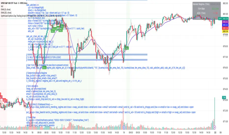 This indicator is a specialized Multi-Timeframe Trend & Regime System designed specifically for intraday trading on SPY, QQQ, and SPX. It is optimized for high-volatility execution (like 0DTE) by filtering out "choppy" low-probability conditions before they happen.