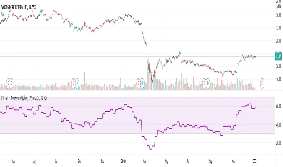 Using rsi with security function directly will cause repaint. Hence, doing it based on close price and calculating rsi via formula to avoid that. Hope this solves repainting issue.