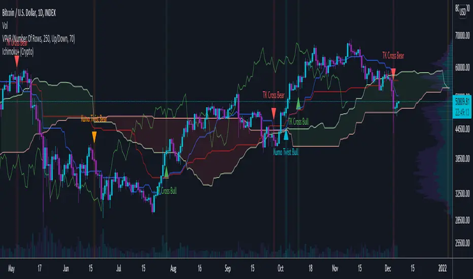 Based on the ichimoku cloud system, this indicator gives two presets: Standard (9/26/52/26) and Crypto (20/60/120/30).