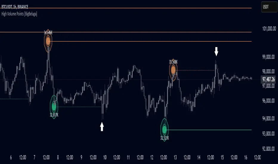 High Volume Points [BigBeluga] is an essential tool for traders looking to track institutional activity, analyze liquidity zones, and refine their entries based on volume-driven market structure.