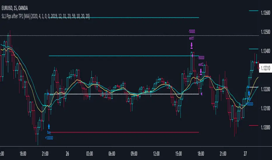 When the first take profit is achieved, half of the position is closed and the first stop loss is moved to the entry-level. The rest of the position is open to achieve either second take profit or second stop loss.