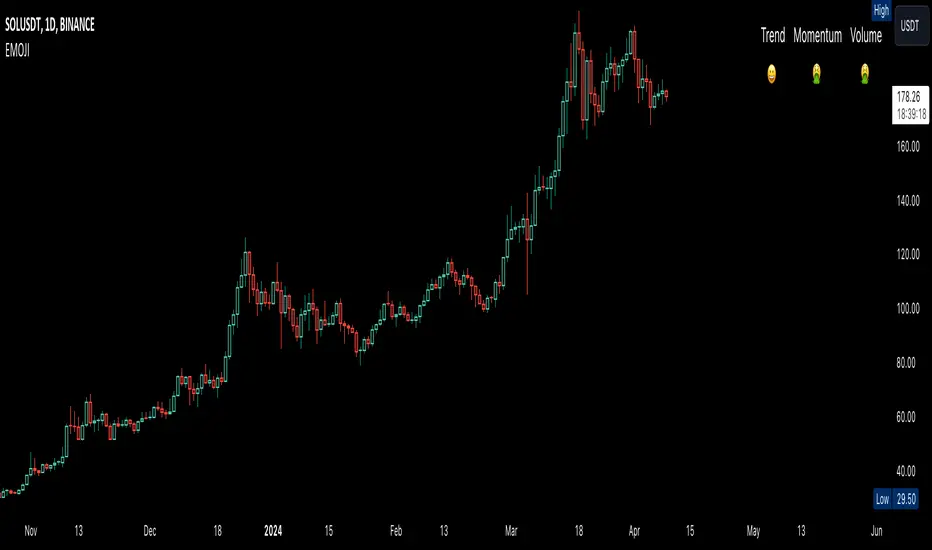Volume Delta: The indicator calculates the difference between the current trading volume and a simple moving average of the volume (Volume Delta). If the Volume Delta is above a user-defined threshold, it is considered "Good" or bullish (😀). If the Volume Delta is below the negative of the threshold, it is "Bad" or bearish (🤮). Values within the threshold are considered "Neutral" (😐).
