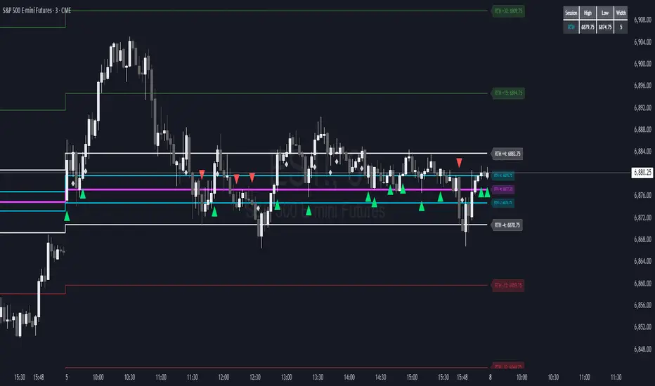 Adjustable Scalp Levels: Customizable +/- point lines from RTH range (default 4 points) for precise entry/exit management.