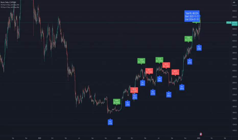 It identifies potential buy signals based on a specified percentage drop in price over a set number of days and calculates the total profit or loss (P/L) over a predefined period. Here's a breakdown of the script and its key parameters: