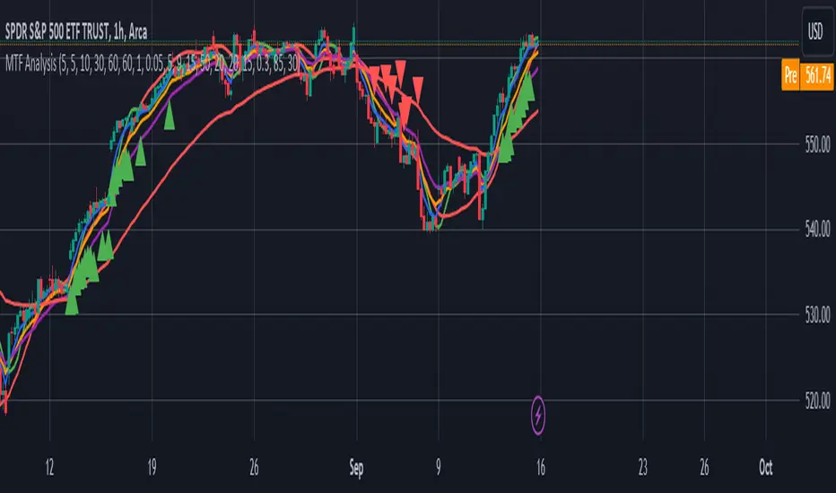 # MTF Analysis IndicatorThe **MTF Analysis** (Multi-Time Frame Analysis) indicator is a comprehensive tool designed for TradingView that combines multiple technical analysis methods to help traders identify potential trading opportunities. It integrates moving averages, linear regression lines, pivot points, support/resistance levels, and various filters to generate bullish and bearish signals.