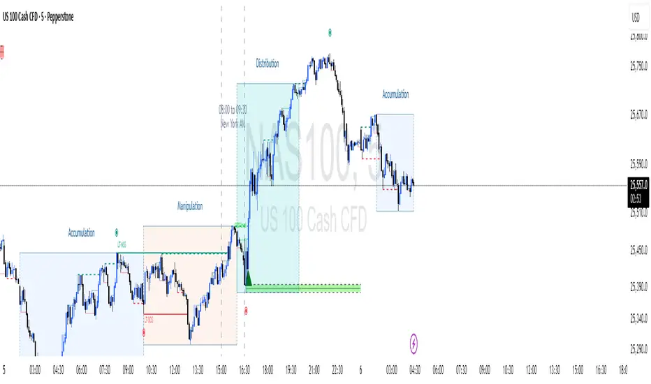 Includes built-in logic to align trades with the New York Opening Range (08:00–09:30 EST) and NY Trading Hours (09:30–17:00 EST). Key session highs/lows are tracked and labeled automatically.