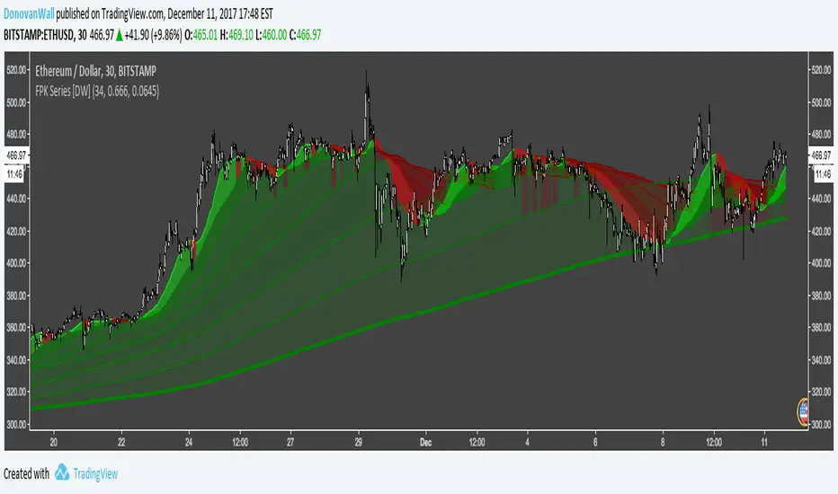 This study is a simple experiment using Kaufman's Adaptive Moving Average that plots a base average with a period of your choice, then plots averages with periods multiplied by Fibonacci numbers 2 through 34.