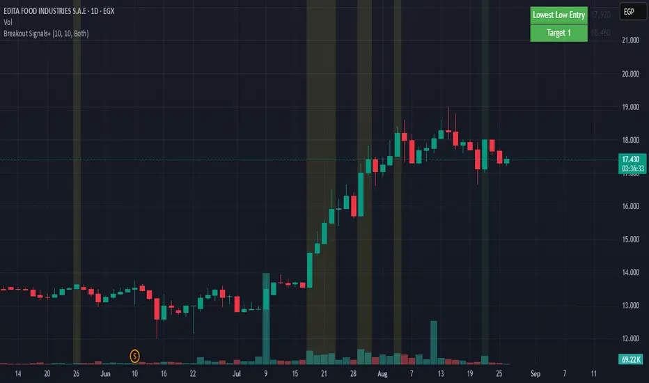 * **Lowest Low Breakout:** This signal is triggered when the current bar closes above the high of the previous bar, and that previous bar had the lowest low within a user-defined lookback period. This indicates a potential bullish reversal after a short-term downtrend.