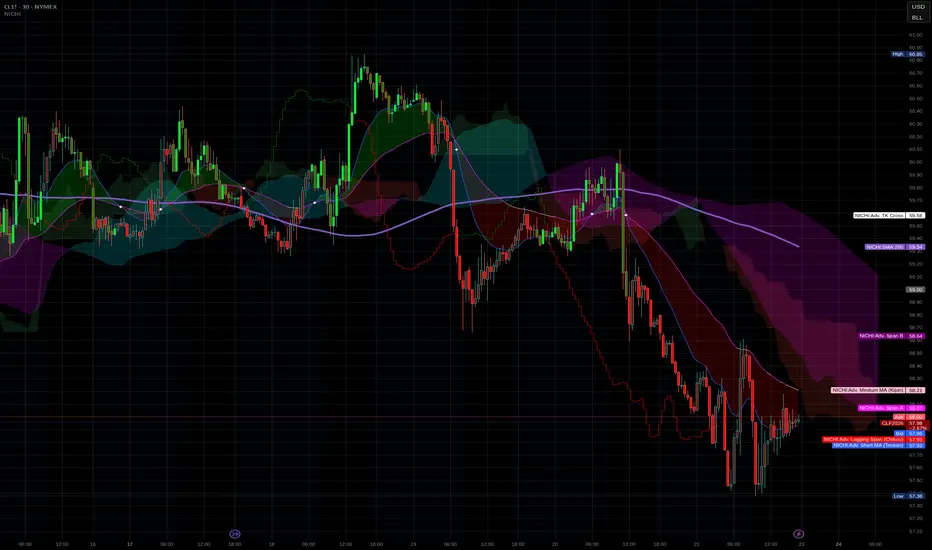 **NICHI (Nuwen’s Ichimoku)** is a next-generation Ichimoku system that merges the classical Hosoda Ichimoku with a modular adaptive-smoothing engine, enhanced Kumo logic, directional trend counters, and multi-mode bar coloring.
