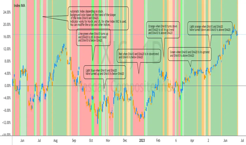 It then alculated the EMA10 and EMA20 for the index and plots the background depending on 6 differnet conditions.