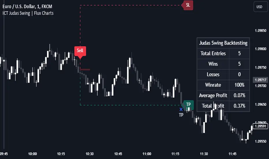 This indicator is an all-in-one suit for the ICT's Judas Swing concept. It's capable of plotting the strategy, giving signals, a backtesting dashboard and alerts feature. Different and customizable algorithm modes will help the trader fine-tune the indicator for the asset they are currently trading. Three different TP / SL modes are available to suit your needs. The backtesting dashboard allows you to see how your settings perform in the current ticker. You can also set up alerts to get informed when the strategy is executable for different tickers.