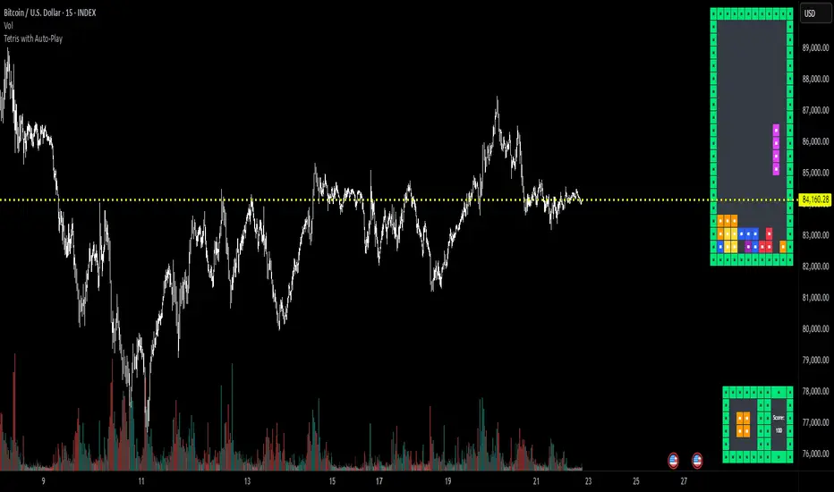 This indicator is implemented in Pine Script™ v6 and serves as a demonstration of TradingView's capabilities. The core concept is to simulate a classic Tetris game by creating a grid-based environment and managing game state entirely within Pine Script.