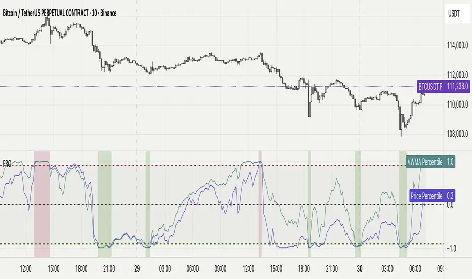 Percentile Rank Oscillator measures how extreme current price behavior is relative to its own recent history. It calculates a rolling percentile rank of price midpoints and VWMA deviation (volume-weighted price drift). When price reaches historically rare levels – high or low percentiles – it may signal exhaustion and potential reversal conditions.