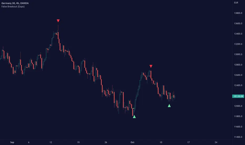 False Breakout (Expo) is an indicator that detects false breakouts in real-time. A false breakout occurs when the price moves through a certain level but doesn't continue to accelerate in that direction. This is because the price does not have enough momentum and the buying interest at this level is not high enough to keep pushing the price in that direction. Instead, the market reverses! All breakout traders are now forced to close their positions at a loss. However, contrarian traders that have identified this false breakout do get a perfect entry for a great reversal trade!