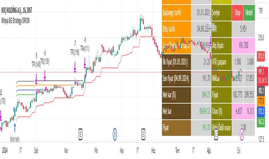 Niteya BG Strategy ORION, al ve sat kararlarını, bir indikatörün sinyallerini iki indikatör ile destekleyerek veren, iki indikatörü (Trend gücü ve hacim) de kullanıcı isteğine bağlı olarak bu kararların alınmasında devreye sokarak, long işlemlere giriş ve çıkış yapılmasını sağlayan bir stratejidir.