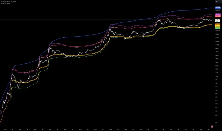 The "Bitcoin Cycle Master" indicator is designed for in-depth, long-term analysis of Bitcoin's price cycles, using several key metrics to track market behavior and forecast potential price tops and bottoms. The indicator integrates multiple moving averages and on-chain metrics, offering a comprehensive view of Bitcoin’s historical and projected performance. Each of its components plays a crucial role in identifying critical cycle points: