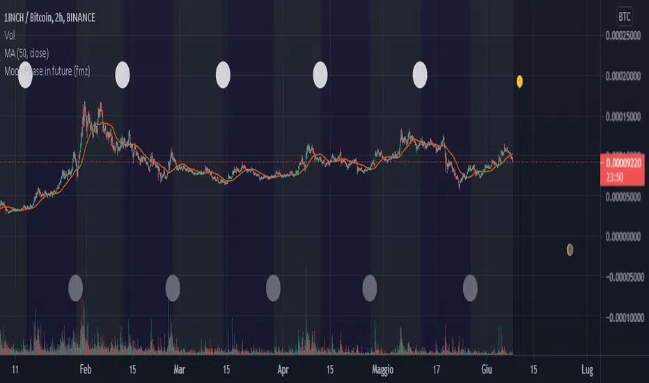 This script allows you to indicate the date of the full moon and the new moon, assuming a distance similar to that of past events to roughly indicate the two future moons. This is not about trading signals, but a study to see how to draw future elements in the chart.