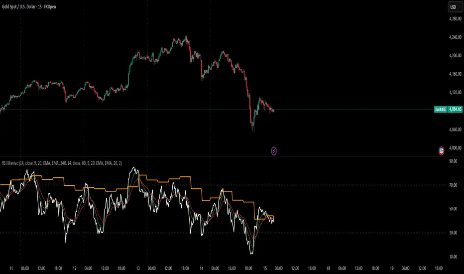 A powerful, fully-customizable RSI indicator designed for traders who want deeper insight into momentum across multiple timeframes. This indicator enhances the traditional RSI by adding multi-timeframe analysis, multi-timeframe moving averages, and optional Bollinger Bands applied directly on the RSI curve.