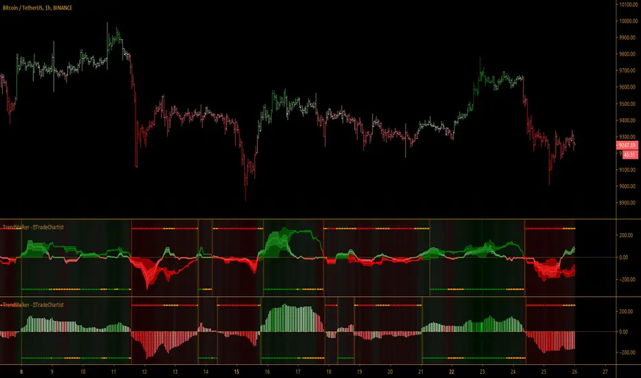 Displays TrendStalker plots stalking the Market Bias based on Price for the asset on the Chart Timeframe. Change in Market Bias can be easily seen through the Convergence/Divergence of the TrendStalker plots.