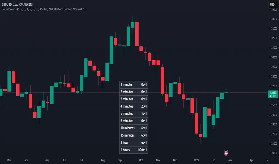 An adaptation of 'Countdown Candle RRS' by reza9300 (tradingview.com/script/uwXeCY1Y-Countdown-Candle-RRS/), including up to 10 customizable time frames, plus some additional table styling options.