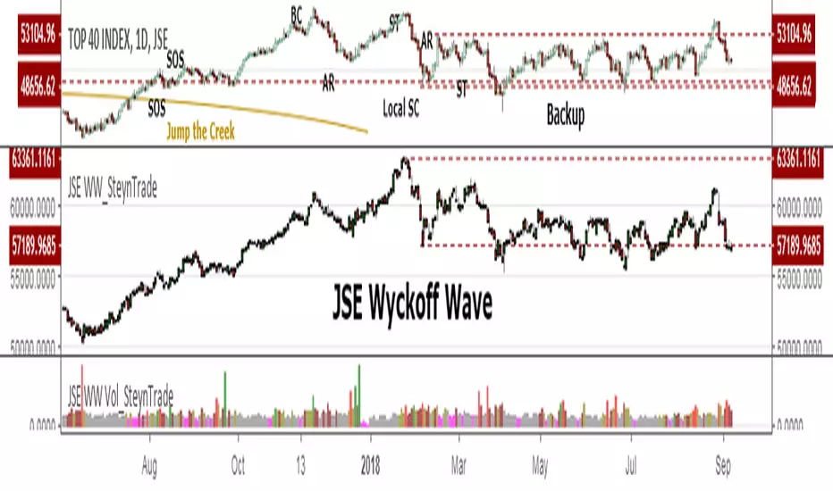 The Stock Market Institute (SMI) describes an propriety indicator the "SMI Wyckoff Wave" for US Stocks. This code is an attempt to make a Wyckoff Wave for the Johannesburg Stock Exchange (JSE). Once the wave has been established the volume can also be calculated. Please see code for the JSE Wyckoff Wave Volume which goes with this indicator.