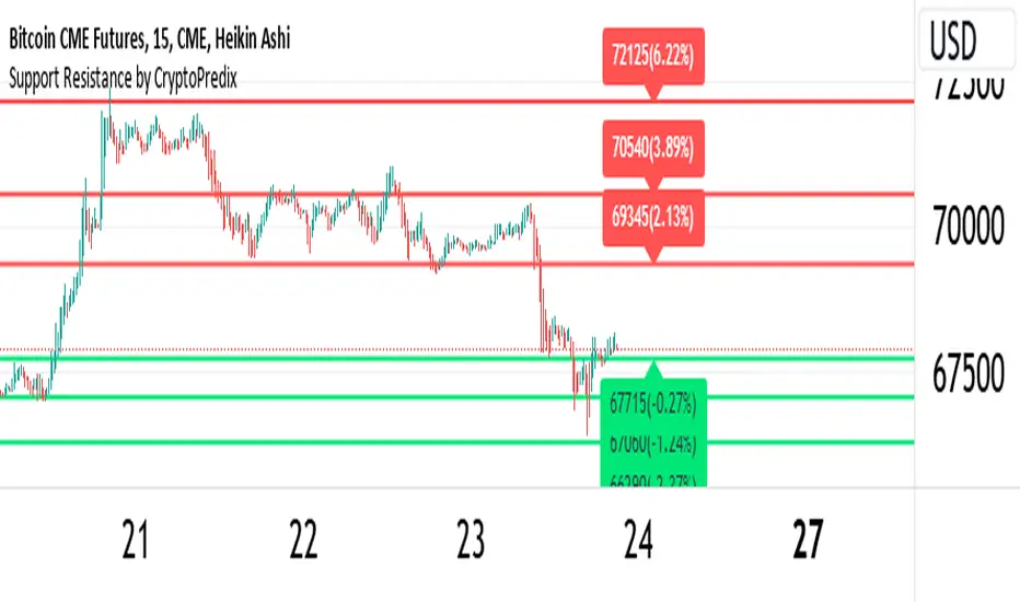 10. Visualization: The script provides visual cues on the chart by plotting support and resistance lines with different styles and colors.It also dynamically updates labels to display the level values and their percentage distance from the current close price.