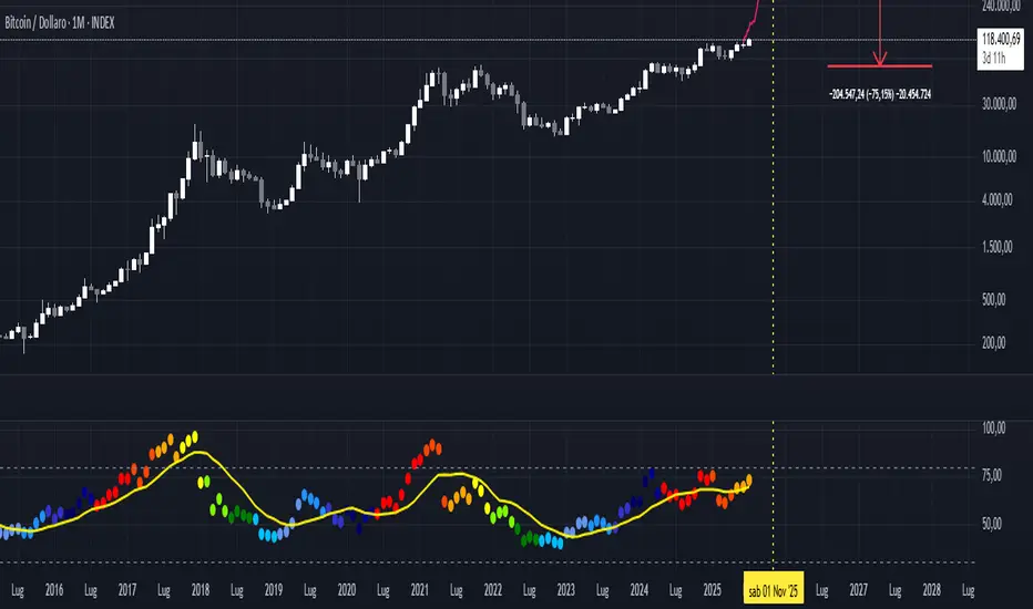 This custom RSI indicator colors the RSI line based on the number of months remaining until the next Bitcoin halving. The closer we get to the halving, the warmer the color—ranging from deep blue (far from halving) to bright red (near halving).