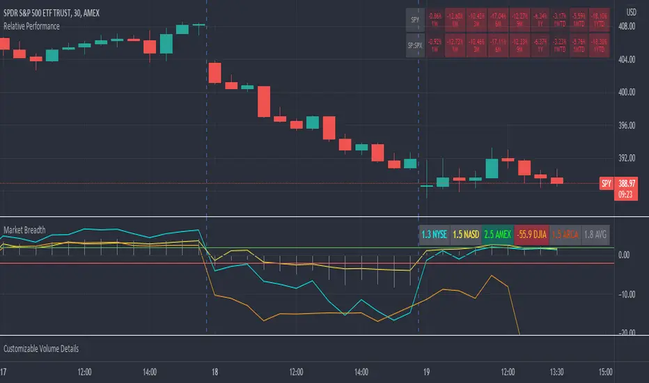 This indicator provides breadth ratios for various indices/exchanges based on the up/down volume.