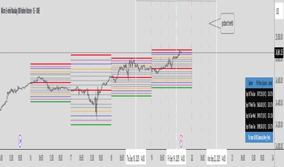 This tool draws structured possible support/resistance price-level frameworks anchored to a daily “Fix” at 16:00 and lets you study intraday expansion/mean-reversion from that anchor. It overlays three families of levels: