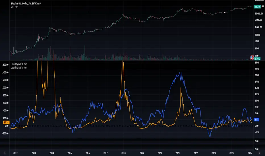 This indicator calculates the Year-over-Year (YoY) percentage change for two critical metrics: a custom Liquidity Index and Bitcoin's price. The Liquidity Index is derived from a blend of economic and forex data representing the M2 money supply, while the BTC price is obtained from a reliable market source. A dedicated