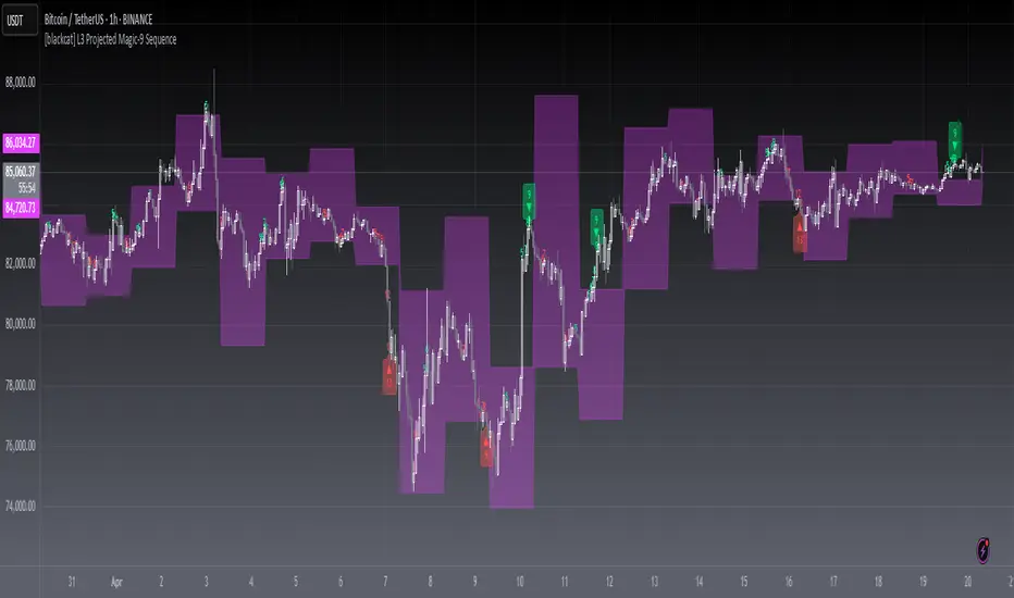 The [blackcat] L3 Projected Magic-9 Sequence indicator is a sophisticated tool designed to help traders identify potential trend reversals through a unique sequence of price movements. By calculating projected highs and lows based on previous bar conditions, this script provides valuable insights into possible future market directions. It plots these key levels on the chart and highlights specific sequential patterns that often precede significant reversals, offering traders a visual advantage in their decision-making process 📈💡.