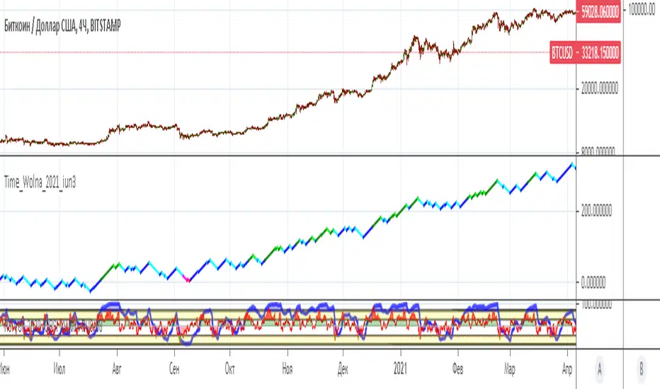The initial idea was to use my RSIVol indicator to study the time. Each bar is counted as a unit of time. If the price rises during the period of one bar, then one is added, if the price falls, then one is subtracted. By default, the blue line shows this time movement according to the RsiVol indicator.