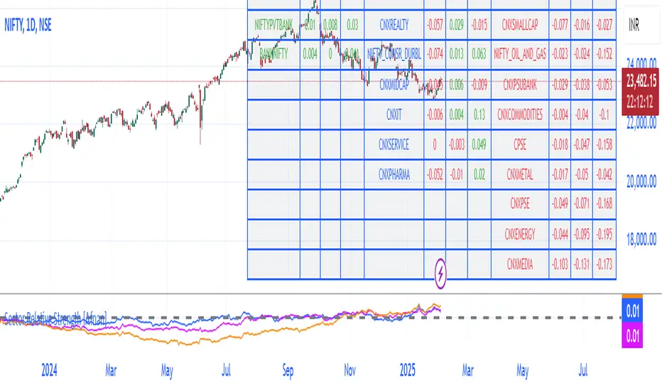 This indicator calculates and displays the relative strength (RS) of multiple sectors against a chosen benchmark. It allows you to quickly compare the performance of various sectors within any global stock market. While the default settings are configured for the Indian stock market , this tool is not limited to it; you can use it for any market by selecting the appropriate benchmark and sector indices.