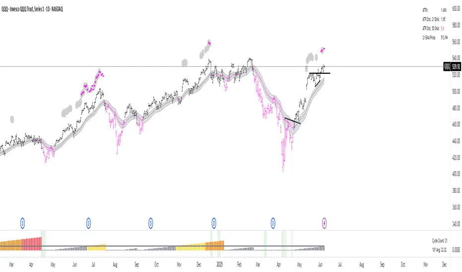 The 21DMA Structure Counter is an advanced technical indicator that tracks consecutive periods where price action remains above a 21-period moving average structure. This indicator helps traders identify momentum phases and potential trend exhaustion points using statistical analysis.