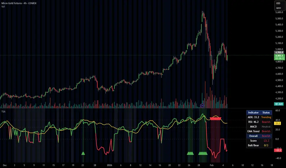 Clear visual trend bias with color‑coded backgrounds to highlight strong trending vs ranging environments.
