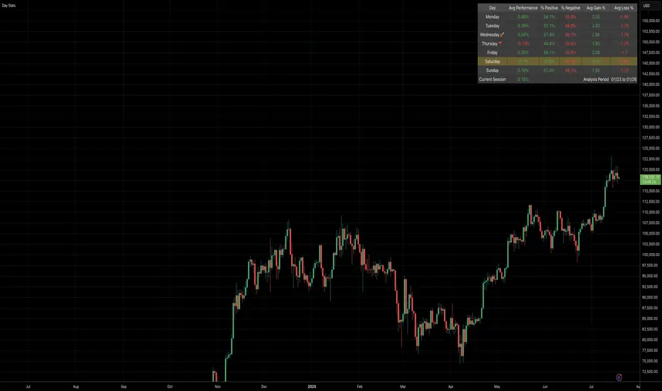 This Pine Script indicator analyzes historical price data to provide comprehensive day-of-week performance statistics, helping traders identify patterns and optimize their trading strategies based on which days historically perform better or worse.