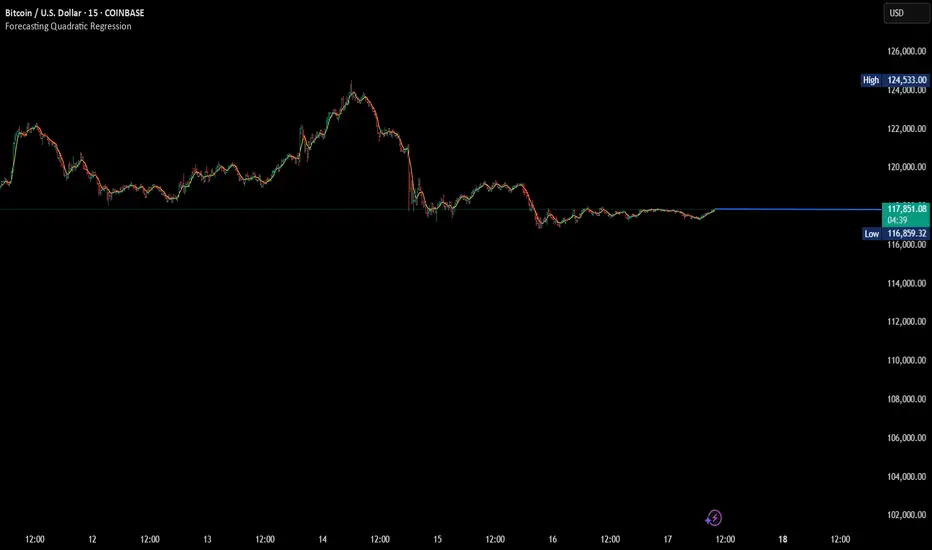 Forecasting Quadratic Regression applies a second-degree polynomial regression model to price data, offering a non-linear alternative to traditional linear regression. By fitting a quadratic curve of the form:
