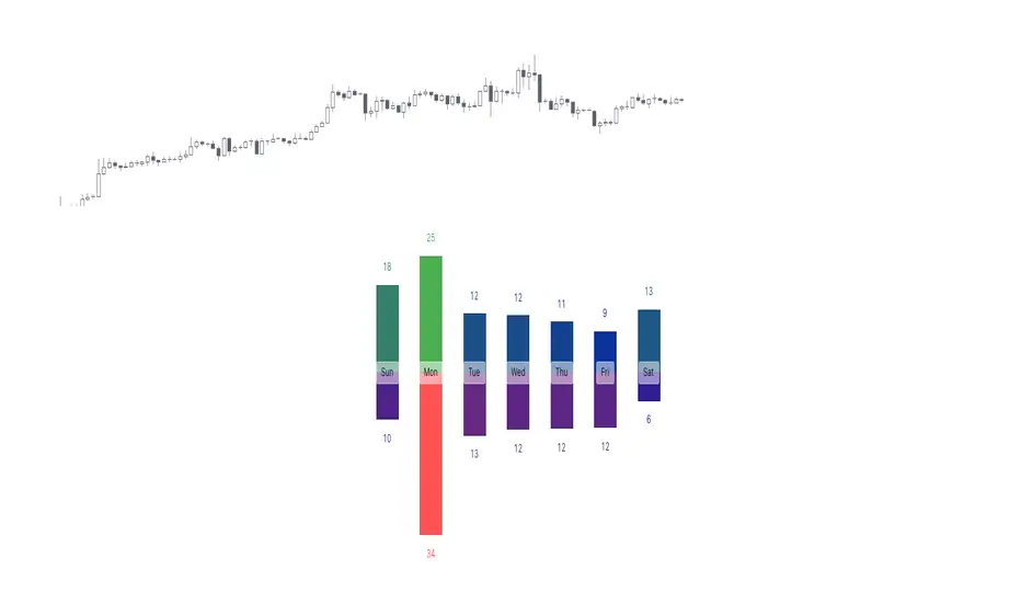 The indicator analyzes the days of the week from the daily chart. The daily trading sessions are defined by the symbol (e.g., 17:00 - 17:00 on EURUSD).