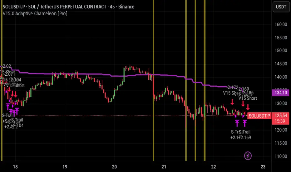 **Adaptive Chameleon** is a fully automated TradingView strategy powered by a signal engine based on multi-timeframe trend analysis, adaptive moving averages, and a volatility filter. The goal is to trade in the direction of a strong and confirmed trend, avoid opening trades in weak or manipulative price zones, and establish positions with a clearly defined risk/reward ratio.
