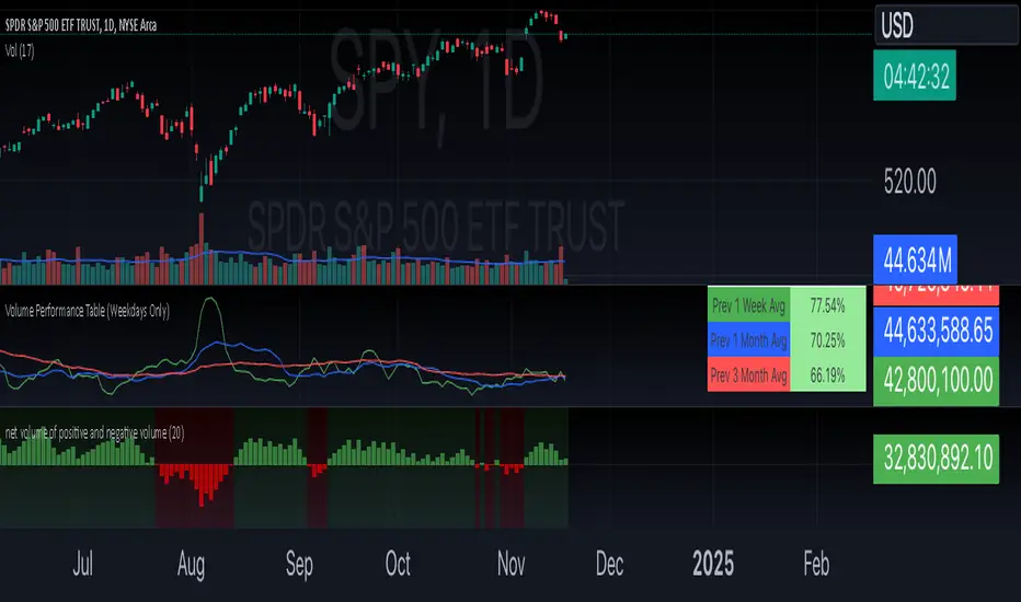 This is a volume performance table that compares the volume from the previous trading day to the average daily volume from the previous week, 1-month, and 3-month period in order to show how the rate of change of volume is contributing to the price trend.Green = Average 1-week volume
