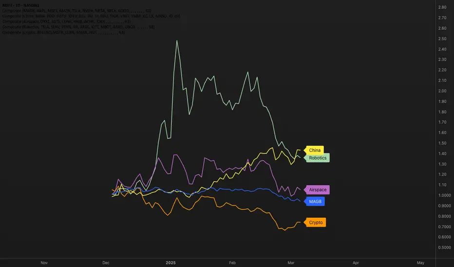Custom Index Composite calculates an unweighted composite index by averaging the daily returns of multiple stock tickers. Instead of using price-level weighting, it focuses solely on percentage change, allowing you to compare diverse market themes side by side on a common basis.