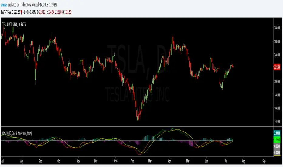 This version includes MACD & its signal line together with OsMA histogram. I have programmed flexibility for switching OFF/ON individual indicator components as well as changing the periods for various moving averages.