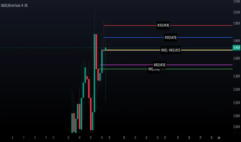 This Pine Script indicator (Key Open Levels) allows users to highlight up to six specific open prices from different times of the trading day as horizontal lines on the chart.