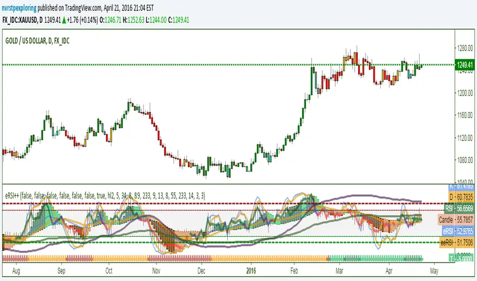 Contains RSI; EMA of RSI; EMA of EMA of RSI; Stochastic Oscillator; 2 Inverse Fisher Transforms on RSI - IFRSI89 and IFRSI233 XOVER on higher timeframes from oversold/overbought is useful signal; RSI Trend/Divergence Candles with color variation based on multiple RSI length detection of trend decay; Chart candle overlay coloring based on RSI, eRSI, and eeRSI EMA55 & EMA233 Xover indicator on bottom for trend direction with color variations for counter trend movements.